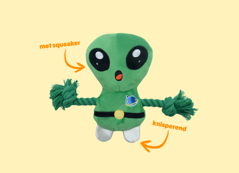 Dit alienvriendje is klaar om jouw hond dolgelukkig te maken en mee te nemen op een speels avontuur naar de ruimte!